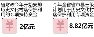 而在全省层面,为了保护这些古村落,一项项行之有效的措施也在一步步落实。比如对进行保护的重点村,省里分别给予每村500-700万元的资金扶持,对一般村,也给予一定的资金扶持;除此之外,还有专项资金以及土地等方面的支持。(记者 吴朝香)