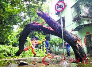广氮社区的一棵大树被拦腰折断。记者莫伟浓摄