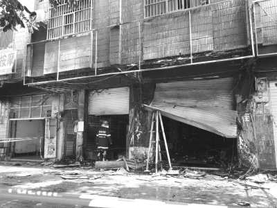 昨日上午11点30分,记者赶到事发现场时看到,该楼房外墙已经被熏黑,一楼共有2个互通的铺面,卷闸门在消防队员救火时已经破拆,店门口天花板上的电线及装饰材料已经烧得七零八落,店内各种物品被烧得面目全非,一片狼藉。