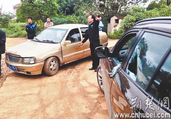 38岁的吴某是左岭镇卸甲村村支部书记。据他介绍,昨日上午9时许,他开车到村部上班,在距离村部约2公里处一条路上,突然冒出来一辆黄色的轿车朝他的越野车冲过来,他打方向盘避让时,结果该车也打方向盘,拦住他的去路。很快,对方车内冲下3个人,轿车后面又围上六七个人,他们手上持着砍刀或斧头,对他的轿车一阵打砸。
