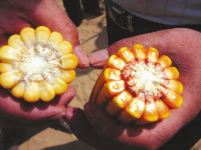 9月16日上午,记者赶至武威市凉州区九墩滩指挥部十墩村七组姜生成家的玉米地进行查看。姜生成随手掰了附近一片地的一棒玉米,又从自家玉米地掰了一棒,两相对比,自家的玉米不仅个头矮小,颗粒萎缩,就连玉米芯也呈现白色,没有普通玉米芯红色健康的特征。记者靠近再仔细对比查看,果然,附近大片大片成熟的玉米地个个茁壮矗立,惟姜生成、王宏等7户村民种植的玉米不仅个头萎缩,长出的玉米棒也近似畸形,不成规则。