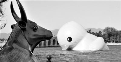 昨日,颐和园,大黄鸭完全放气后漂浮在昆明湖上。