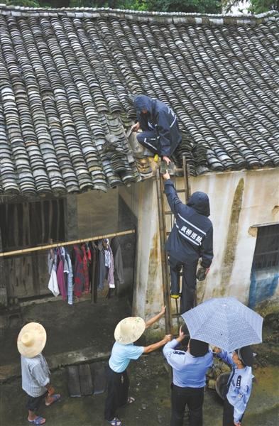 6月14日下午,枫桥镇乐山村低保户杨铁明的住房严重漏雨,得知情况后,枫桥派出所副所长吴嘉军带志愿者前往维修。摄影/田雨
