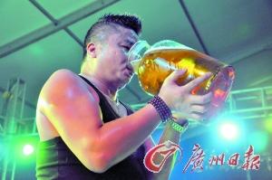 本月7日,第八届广东国际啤酒节在常平铁路公园落下帷幕,10天共接待游客近15万人次,消耗啤酒饮料超过150吨,各类竞饮活动均受市民热捧,还有一名大叔因一口气喝下10斤青岛啤酒,被封“民间酒神”而“走红”:开幕式当晚,他参加拼酒表演,用一个玻璃缸往里灌满酒,一口气喝干,令一旁的酒友们“惊为天人”。