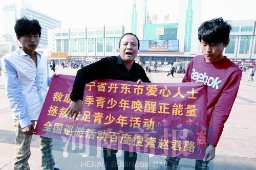 辽宁丹东45岁的单身男士赵君路,有124个孩子喊他“爸”。昨天上午,这位“爸爸”带着他的两个“儿子”在郑州火车站广场巡讲。一应俱全的设备,饱含激情的脱稿演讲,引来不少人围观、议论。