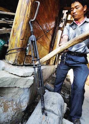 村民王明生家的一栋30多吨的木房已有50多年的历史,因其父辈建房时只是简单地在木柱下用几块大石头支撑和承重,基脚不稳固,加上地质的原因,天长日久木房倾斜的厉害。