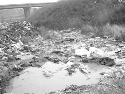 在现场,建筑垃圾、生活垃圾及企业生产后的废旧物资等到处都是。记者以自己的企业也要在这里倾倒废水为由,来到先前记者跟踪的货车倾倒废水的地点仔细查看。走到近处,记者看见一条黄水沟,刚刚倾倒的黄色废水还在向四环桥下的水泡流淌,水沟边的土堆上能明显看到黄色污水和成堆的碎纸屑。