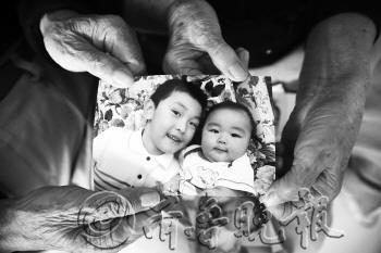 10日,姜桂枝和老伴拿着两个重外孙的照片看,这俩重外孙都在澳洲,一个7岁,一个1岁。 记者 王媛 摄