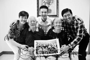 10日,姜桂枝(左二)和老伴杨京香手里抱着俩人结婚60周年时的全家大合影,与小女儿(左一)、儿子(右一)、外孙(后中)拍全家福。 记者 王媛 摄