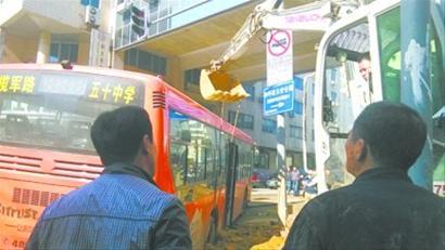 123路公交车的工作人员只好再次向施工队求助:“等中午1点那会,我们再借用一下施工队的大吊车试试。”