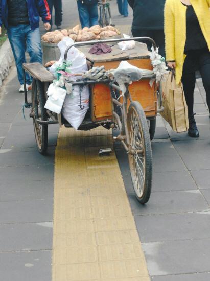 有些道路的盲道则是时断时续,断头或破损盲道随处可见。在沈河区地王花园正门这一段路,人行道修得较窄,盲道则是一段紧靠路边,另一段又忽然出现在要迈上几级台阶的商铺门前。在省肿瘤医院花鸟市场附近,一段盲道靠近马路,另一段盲道却在人行道内侧,两盲道衔接处相隔一米多远。