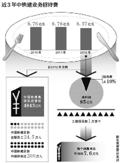 今年5月,中铁建曾对新京报记者回应称,8.37亿业务招待费确实偏高,这一问题前几年已引起公司高度警惕,未来将进一步控制业务招待费。力争2013年业务招待费比上年下降10%以上。即力争不超过7.533亿。