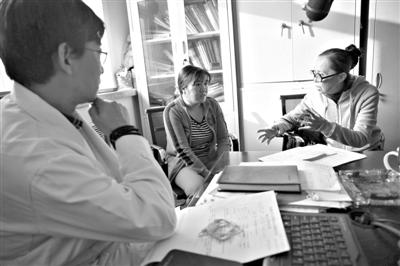 昨日,北京武警总医院,林女士(右一)和医生一起开导冯炯母亲,打消她对手术风险的疑虑。新京报记者 王叔坤 摄