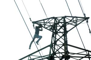 11万伏的高压线铁架上,阿灿(化名)一边大声高歌,一边狂乱地扭动身体,他不时爬来爬去,双手抓住铁架将整个身体悬在24米高的铁架下面。