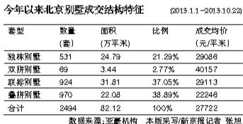 根据北京市住建委网签数据统计,今年截至10月22日,全市已成交2494套别墅类产品,和去年同期的2109套相比,增幅超过18%;今年目前82.12万平米的别墅成交面积同比也有11%的增长。