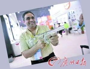 “very nice!”(很不错)昨日在A馆6.1展区,一位英国采购商拿起一把机关枪模样的酒瓶做射击状,连说“酷”。他马上给参展商递上名片,要求送几个样品给他,“我需要几个样品,尝试一下市场。”他最后叮嘱道。据参展商介绍,这种枪形的酒瓶才推出两三个月,这是第一次亮相广交会,但已经“出了一货柜”,销往了西班牙。