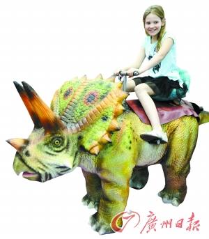 一名外商的孩子正在玩可行走的大玩具恐龙。记者邵权达摄