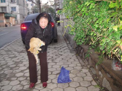 铁东区爱国街193栋居民李女士对记者说,附近有许多流浪猫,李老太看到了,就从家里做好食物,装在塑料袋里,唤它们来吃,老人每天准备饭菜都很精心,鸡肝、火腿肠、鱼汤等。“看,‘猫姥姥’又来喂猫了!”当日清晨,记者见到李文华老人时,她正蹲在地上,从袋子中掏出准备好的猫食放在地上,口中还不停地唤着:“咪咪,快过来吃饭。”一只黄色的猫咪便跑过来,吃饱后还对着李老太“喵喵”地叫。