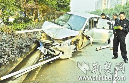 昨日清晨,在黄陂盘龙城巨龙大道上,一辆小车刮倒护栏后,一根铁栅栏从车头插入,夺走司机性命。