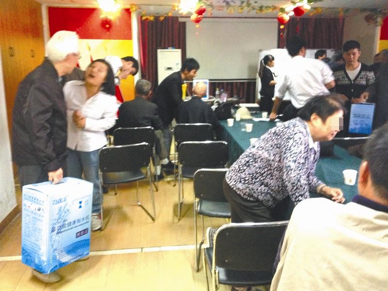 图为:“攻单”现场,一位老人(如图左一)被说服购买了一套制水机