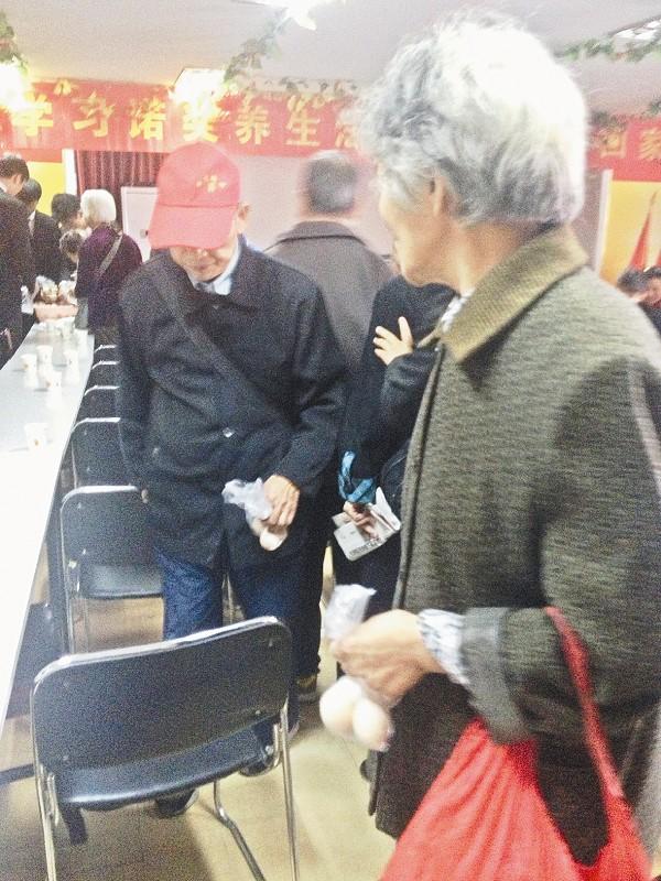 图为:老人们领到免费发放的鸡蛋