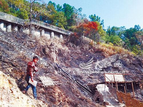 28日上午,记者赶到了景德镇市马鞍山云门公园看到,事发地山势陡峭,周边未被烧光的茅草十分浓密。在已经过火的山坡上,云门公园的修缮单位已经重新搭起了施工用的竹架。记者注意到,山坡下的过火处,离民居最近的仅一米之遥。