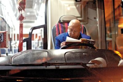 终点站休息期间,刘师傅坐在驾驶室里看书。