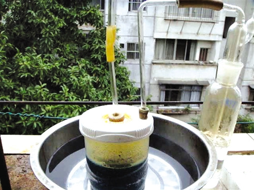 周老伯说,他在化学反应过程时特地用了三条水管来处理这股有毒气体,经过处理后再排放就几乎没有气味了。但如果不做处理,就算打开窗户和大门来做实验,气体也会呛得人受不了。