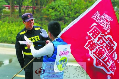 “炯炯族”向一名在户外工作的保安赠送口罩