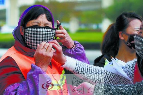 郑州志愿者当街向交警环卫工赠送口罩防雾霾(图)