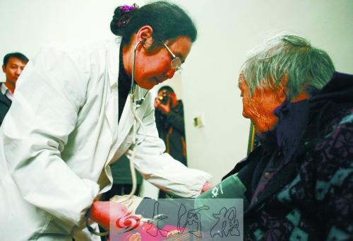 在史家沟村七组罗银娟老人家,记者见到了李月霞,她身穿白大褂,刚给罗奶奶扎上针,正给屋里另一老人检查身体。
