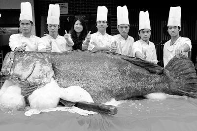 林小姐主要经营一家以石斑鱼为主要元素的美食店,这条巨型石斑鱼是第一次见到。林小姐说,上海吉尼斯纪录是563斤,这条大石斑鱼有683斤,堪称鱼王之王。林小姐说,作为深海鱼,石斑鱼寿命最长约20多年,普通石斑鱼一般重1.5斤左右。(胡国球 黄万全 黄启穆摄影报道)