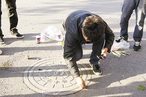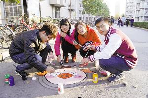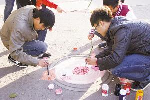 王琦、杨洪、杨柳青青、高放、宋国强等同学对井盖画也兴趣高涨,他们买来防水丙烯颜料、油画笔画了起来。11月7日那天,就画了8个井盖(只画污水、雨水井盖,不在消防井盖上涂鸦)。他们利用井盖本身的凹凸效果和纹理进行创意,越画越熟练,越画越精美,收到了意想不到的效果。