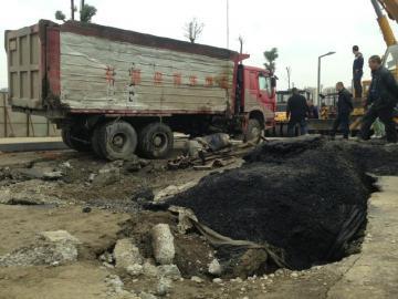 货车行驶中遭遇地陷 一车沥青打翻司机受轻伤