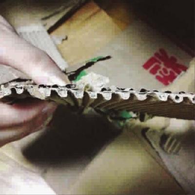 记者尝试用手去掰,发现这些纸板根本无法弯折,坚硬得犹如“铜墙铁壁”。用刀裁下其中一片,可以观察到瓦楞纸之间半圆形的缝隙里塞满了填充物。将纸的部分用水泡烂后,能剥离出许多灰褐色的硬物,用手一捏便碎成粉末。
