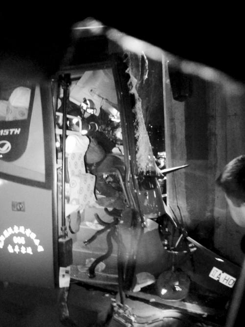 大客车超车逆行猛撞路边桥墩 司机被卡车内(图)