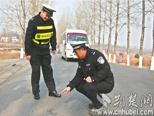 出警民警发现公路上有明显的车辆刹车印痕和两处陈旧血迹,公路边有疑似车辆保险杠塑料碎片。民警推测现场可能发生过交通事故,于是当即电话通知辖区交警。