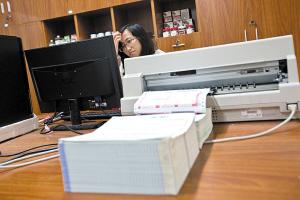客服工作人员的面前,摆放着厚厚的快递打印单