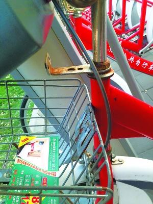 顺利骑行至崇文门内大街内蒙古大厦门前的租还网点后,记者才发现该自行车车筐与车把接合处已经断裂,且原本配备的车铃不知所踪。还车时,记者将自行车车把前的锁孔推进锁车器后,再次出现急促的“嘟嘟嘟”声,更换到另外一个停车位后才还车成功。