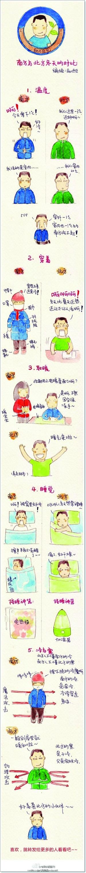 近日,微博网友“@Ben旦旦”以“北方的暖与南方的冷”为主题创作了一系列生动有趣的漫画。漫画里,他从温度差异、穿着多少、取暖方式和睡觉感受等多个方面,图文并茂地向网友证实:南方比北方更冷。最后,还委屈地直呼“南方的冷北方人你不懂”“好羡慕北方的小伙伴”。
