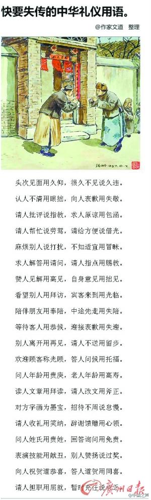 “头次见面用久仰,很久不见说久违;认人不清用眼拙,向人表歉用失敬;请人批评说指教,求人原谅用包涵;请人帮忙说劳驾,请给方便说借光……” 近日,网友@作家文道 总结了一系列“快要失传的中华礼仪用语”,经过大V转发后,引发众多网友的热烈讨论。有大V表示,“传统礼仪,没有敬烟陪酒,没有八面玲珑,传统礼仪用语之美,在于朴实无华中透着一腔真诚!如此美的语言你还知道多少?你的孩子还知道多少?”这一观点获得了不少网友的共鸣。