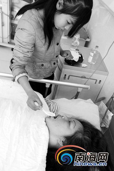 18日,懂事的女儿在病床前照顾刘洁。南国都市报记者陈卫东摄