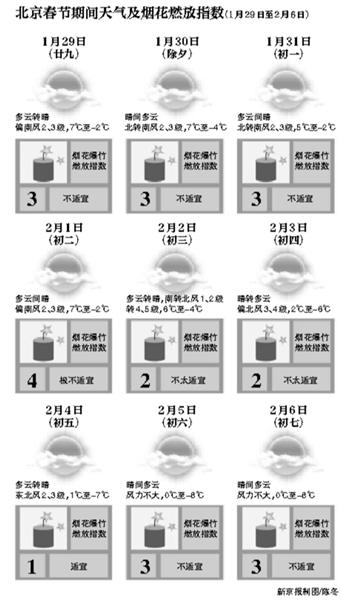 此外,昨天北京市气象局发布春节期间烟花爆竹燃放指数,只有初五一天适宜燃放。