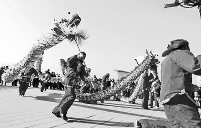 1月28日,山东省滨州经济技术开发区的群众在黄河明珠文化广场,身着节日彩装,狂舞巨龙,迎接新春的到来。本报记者 郭俊锋摄