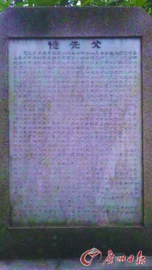 被损坏的是墓亭附属的《忆先父》碑文。根据碑文显示,该墓碑由雷荫棠的女儿雷天禄在1984年冬天所立。记者看到,碑文有多处被尖锐物刻凿损坏的痕迹,在“忆先父”三字下面的两行字被损坏得最为严重,碑刻不可辨认。整块墓碑被凿得最深处的位于左上角,有1.5厘米深的开裂。