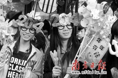 西湖路花市,两位姑娘手拿吉祥物,头戴幻彩“2014”标志。符超军 摄