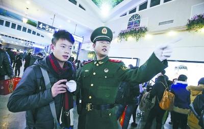 今年的春节,北京火车站里小战士们的春节,就在百姓回家的路上。(记者 李嘉瑞 通讯员 陈亚巍 王溦 摄)