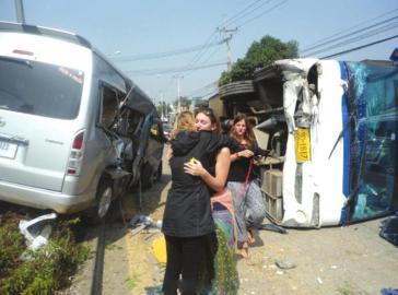 从组团社记者了解到,昨日上午,按照旅游行程安排,46人(含领队)组成的旅行团分别乘坐两辆旅游巴士,正前往清迈双龙寺途中。11点半左右,一辆从侧面岔路驶出的面包车与其中一辆行驶在主干道上的旅游巴士发生碰撞,巴士车发生侧翻,车上25名四川游客不同程度受伤。
