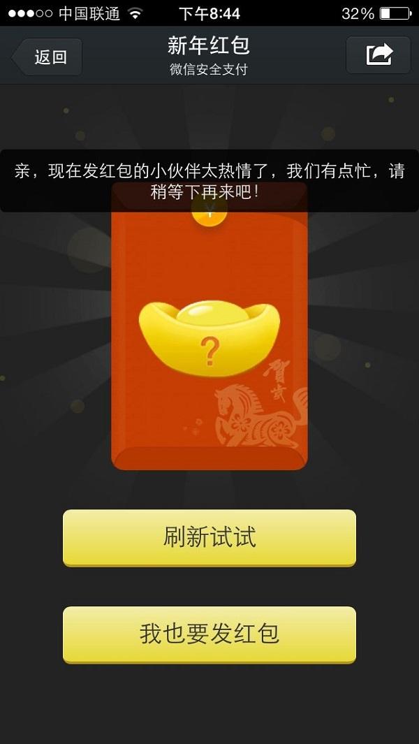 今日晚间,多位网友称,微信红包系统崩溃。有网友发微博称,发出去的红包无法领取。记者试用后发现,偶尔会出现“故障”提示,“亲,现在发红包的小伙伴太热情了,我们有点忙,请稍等下再来。” 记者发现多刷新几次,微信抢红包系统可以继续使用,想抢红包的网友不妨多刷新几次。(新民网 胡彦珣)