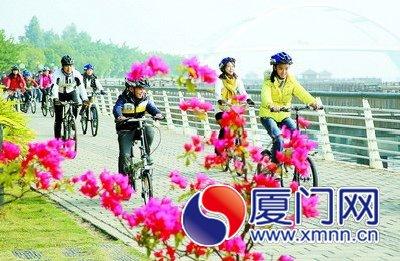 市民在五缘湾骑行,尽享假日时光。